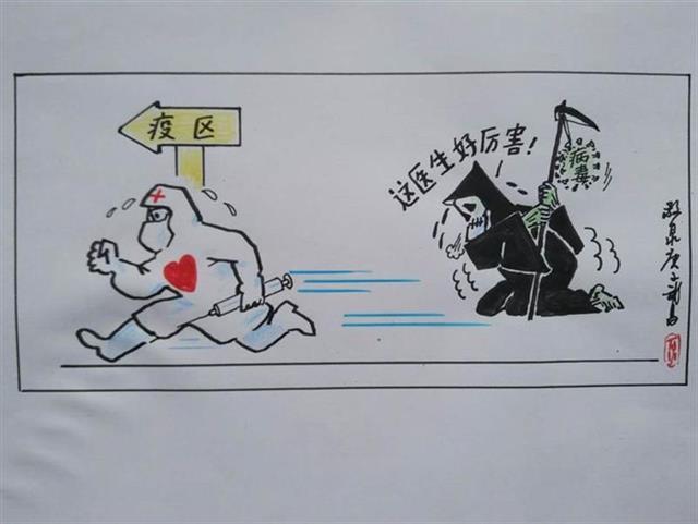 在抗击新冠肺炎疫情的战斗中,广大医护工作者舍己为人的动人事迹感动了邹敬泉,于是白衣天使成为他漫画中出场最频繁的形象。白衣“战士”身骑白龙驹,快马加鞭地迈过了“清零”的门槛,手中的红缨枪正刺向逃跑的新冠病毒,头顶的艳阳仿佛胜利的曙光。在漫画《清零》中,邹敬泉将对战胜病毒的美好期待表达得淋漓尽致。