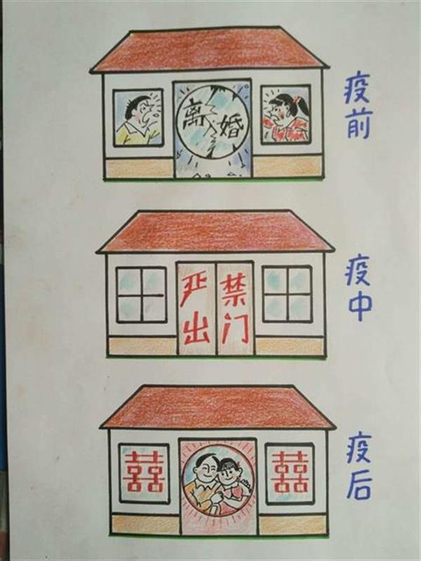 在邹敬泉笔下,宅家的市民形象也别有趣味:独坐家中诵读《中国通史》;漫画佳作好似“雪片”般满屋飞;更有疫情前吵架闹离婚的小两口,因为宅家患难与共的原因,疫情后“破镜重圆”。